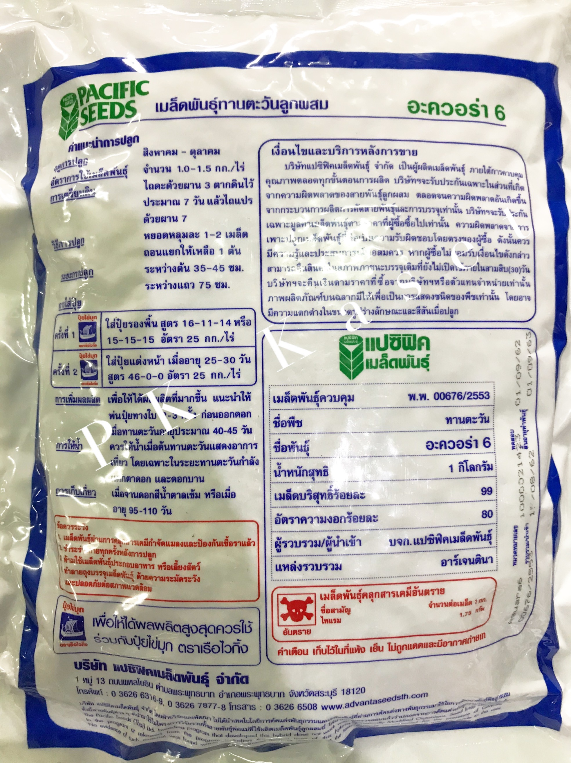 เมล็ดทานตะวัน พันธุ์ อะควอร่า6 ขนาดบรรจุ 1 kg วิธีการปลูกที่แนะนำจากร้าน PK Kaset - อัตราการใช้เมล็ดพันธุ์ 1.0-1.5 kg ต่อไร่ การเตรียมดิน - ไถดะด้วยผาน3 แล้วตากดินไว้ 7 วัน แล้วไถแปรด้วยผาน7 วิธีการปลูก - หยอดหลุมละ 1-2 เมล็ด และถอนแยกให้เหลือ 1 ต้นต่อหลุมการใส่ปุ๋ย - ครั้งที่ 1 ใส่ปุ๋ยรองพื้น สูตร 16-11-14 หรือ 15-15-15 อัตรา 25 kg ต่อไร่ - ครั้งที่ 2 เมื่ออายุ 25-30 วัน ใส่ปุ๋ยสูตร 46-0-0 อัตรา 25 kg ต่อไร่ การเพิ่มผลผลิต - ให้ฉีดพ่นปุ๋ยทางใบ 2-3 ครั้ง ก่อนออกดอก เมื่อทานตะวันอายุได้ 40-45 วัน การให้น้ำ - ควรให้น้ำเมื่อทานตะวันแสดงอาการเหี่ยว โดยเฉพาะในระยะทานตะวันกำลังแตกตาดอก และดอกบาน การเก็บเกี่ยว - เมื่อจานดอกสีน้ำตาลเข้ม หรือเมื่ออายุ 95-110 วัน ![]() ![]() ![]() ![]() ![]() ![]() ![]() |